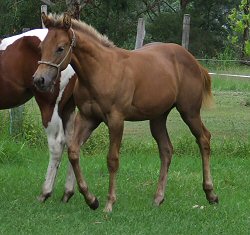 The Big Gun (USA) x Sheza Grand Sensation 2012 Chestnut Paint Bred Filly - 13830 Genetic colour results: e/e, A/A PSSM1 neg - HERDA neg Page updated 26.09.2013 |